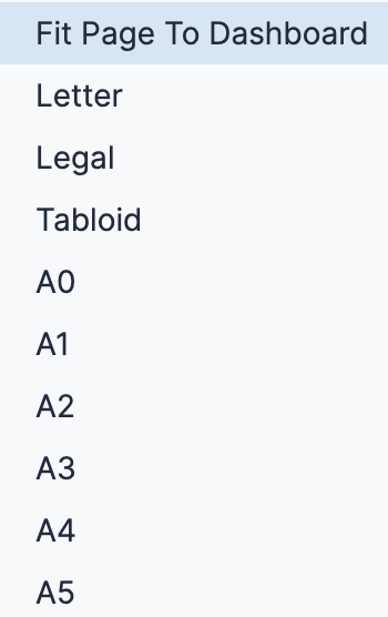 Select an option from the Paper Size drop-down menu. The Fit Page to Dashboard option is the default; it sizes the PDF to match the layout of the dashboard on the screen. Other paper size options size the PDF to match a standard paper size and fit the dashboard within it.