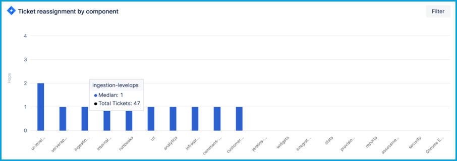 Hops describes the number of times a ticket is reassigned to a new assignee (someone who has never been assigned to that issue before). Hops can occur if an issue isn't triaged correctly initially, or if the issue doesn't have enough information to be assigned correctly. Excessive hops can potentially cause missed SLAs and unnecessary resource utilization.