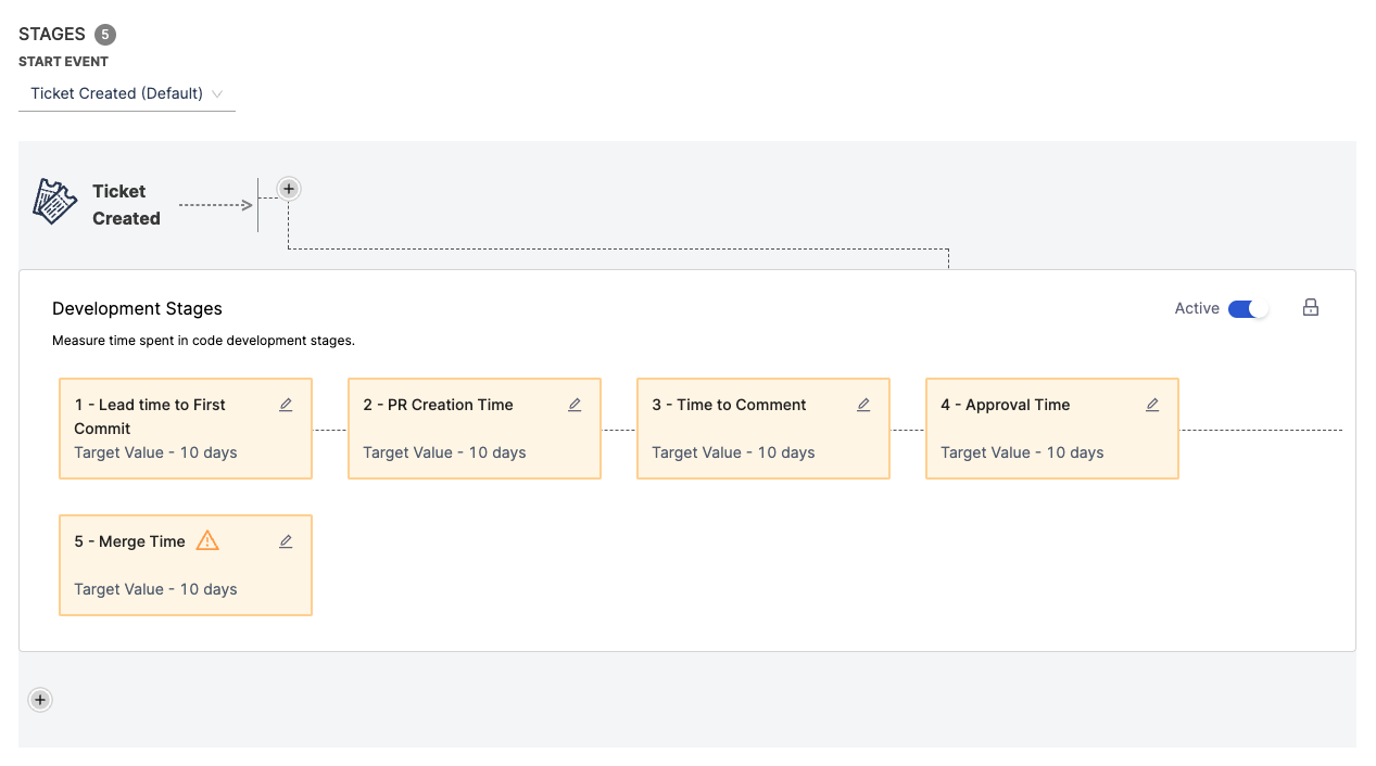 - Review the pre populated Stages that represent the PR lifecycle, from PR creation to merge. You can edit, add, and remove stages as needed. You can edit the data or fields that drive each stage, set time range goals, and more.