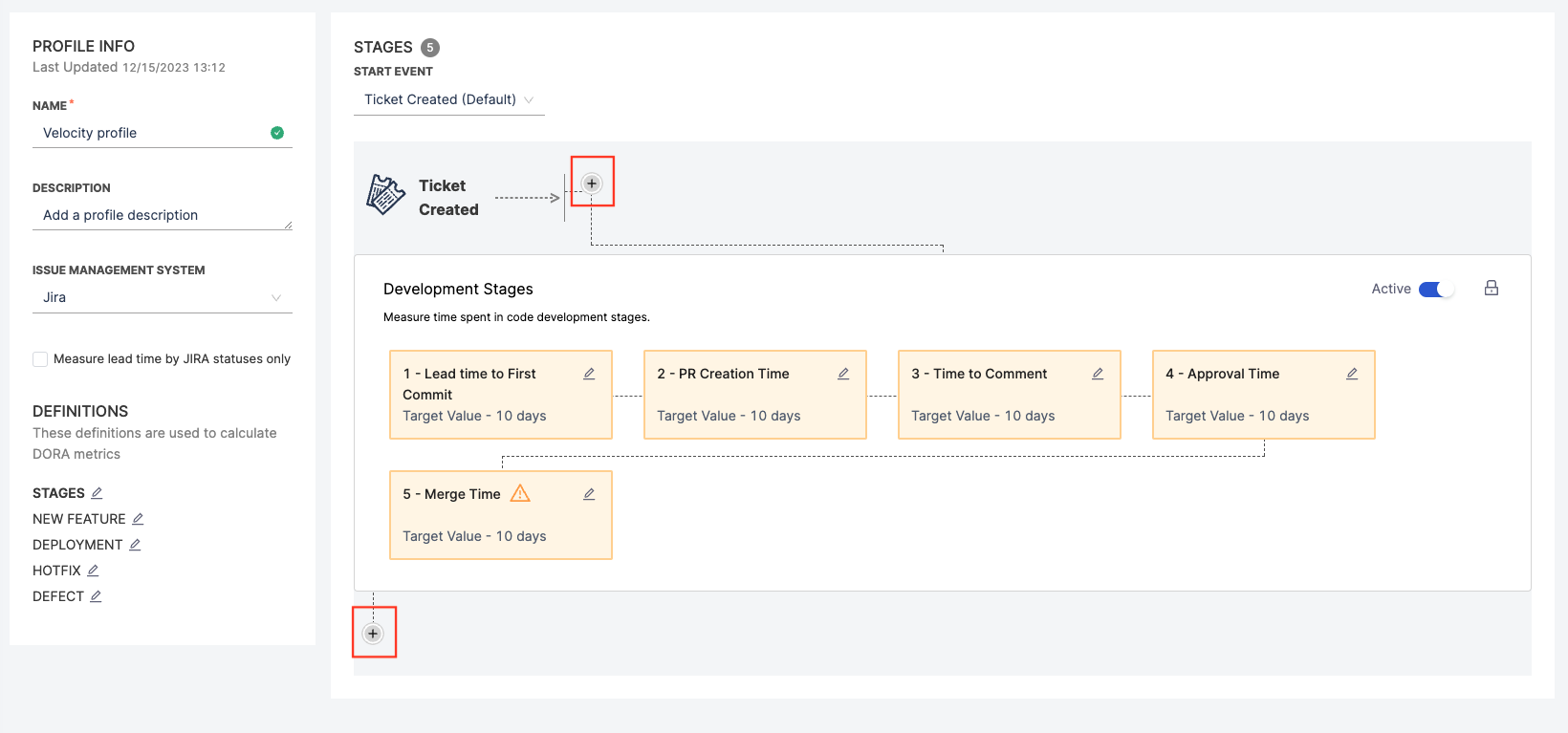 - To track progress in your issue management tool, select the + icon to add stages before and after the Development Stages. This allows you to track progress in both your issue management and SCM tools, from issue creation through code deployment.