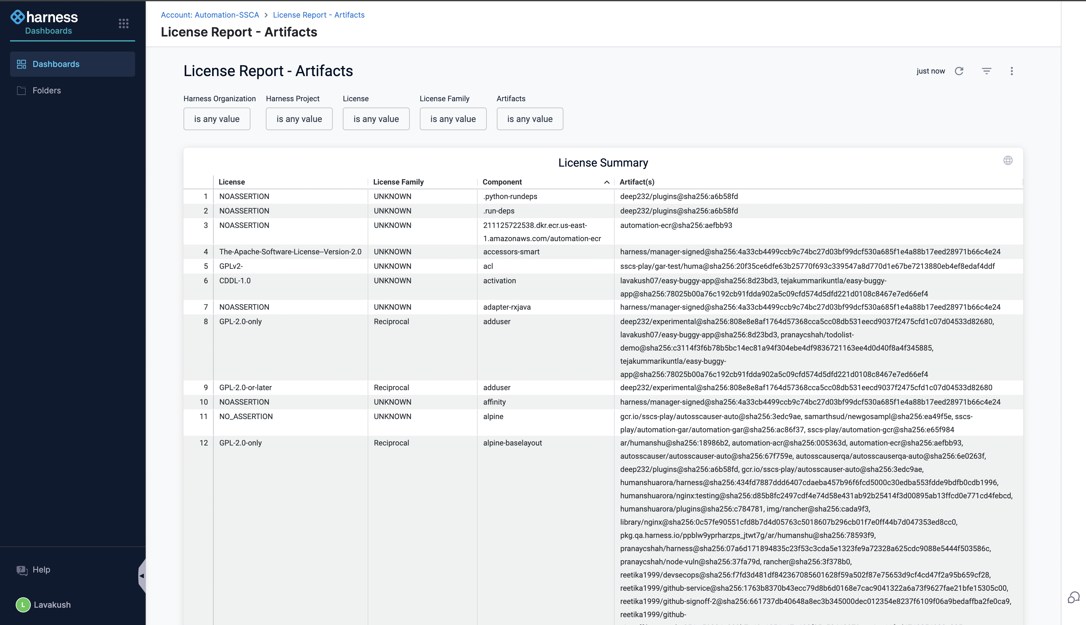 With Harness License Reports Dashboards, you can easily access detailed information about the licenses and license families associated with your artifacts or code repositories and all the relevant data in one place, which eliminates the need to manually check each component’s license individually across all the projects.