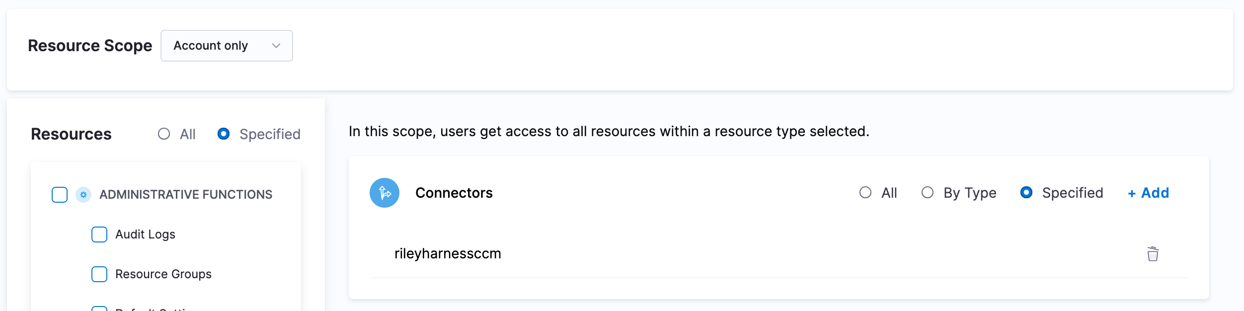 Under "Shared Resources" select "Connectors" and then "Specified". Here you can select all the CCM AWS Account Connectors for the accounts which you want to give access to.